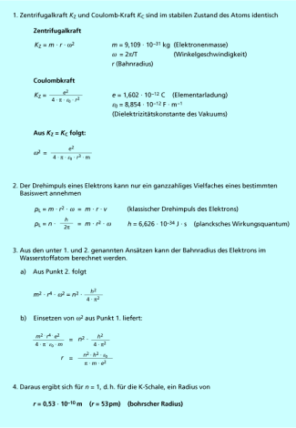 Die Grundidee war zunächst ein dynamisches Gleichgewicht zwischen der COULOMB-Kraft und der Zentrifugalkraft. Wenn die Elektronen auf stabilen Bahnen um den Kern kreisen, muss die Zentrifugalkraft genau gleich der Anziehungskraft des Elektrons durch die positive Kernladung sein. Aus der Gleichsetzung der Kräfte und der Berücksichtigung des Bahndrehimpulses der Elektronen konnte BOHR den Radius der Elektronenbahnen im Wasserstoffatom berechnen.
