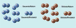 Die Elemente Sauerstoff und Stickstoff treten hauptsächlich in Form zweiatomiger Moleküle auf.
