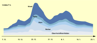 Aufeinandertreffen von Hochwasserwellen verschiedener Flüsse beim Rheinhochwasser 1993/94.
