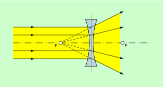 Trifft paralleles Licht auf eine Zerstreuungslinse, dann läuft es hinter der Linse auseinander (Bild 4). Es scheint dabei von einem Punkt herzukommen. Wie bei Sammellinsen bezeichnet man diesen Punkt als Brennpunkt F. Die Abkürzung F kommt von focus, der lateinischen Bezeichnung für den Brennpunkt.