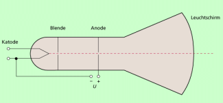 Eine andere Möglichkeit der Bestimmung der spezifischen Ladung von Elektronen besteht darin, mit einer Katodenstrahlröhre (braunsche Röhre) einen Elektronenstrahl zur erzeugen (Bild 3) und diesen Elektronenstrahl einem homogenen Magnetfeld auszusetzen, wobei auch hier die Bewegungsrichtung der Elektronen und die Feldrichtung senkrecht zueinander sind. Das homogene Magnetfeld kann das zwischen HELMHOLTZ-Spulen sein. Man kann aber auch das relativ schwache und in einem kleinen Raumbereich konstante Magnetfeld der Erde nutzen. Dann müsste man folgendermaßen vorgehen: