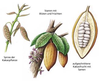 Die Gattung Theobroma, die zu der Familie der Sterculiaceae gehört, ist mit 20 Arten in den Tropenwäldern Amerikas vertreten. Die wichtigste dieser Arten ist der Kakaobaum Theobroma cacao L., der mit hoher Wahrscheinlichkeit ursprünglich aus dem Amazonas- und dem Orinocobecken stammt, inzwischen aber auch in Mittelamerika, Westafrika und Südostasien angebaut wird. Der Kakaobaum ist ein kleiner, 4 bis 10 Meter hoher Baum mit horizontal abstehenden Ästen, die eine dichte Krone bilden. Seine immergrünen Blätter sind ca. 30 Zentimeter lang, von glänzend dunkelgrüner Farbe und länglich ovaler, vorne zugespitzter Form. Die ca. 1 Zentimeter großen gelblichen Blüten mit fünf Blütenblättern und einer fünfspaltigen Narbe entstehen das ganze Jahr über am blattlosen Stamm des Baums (Kauliflorie: Blütenbildung direkt am Stamm) und an den dickeren Seitenästen (Ramiflorie: Blütenbildung direkt an dicken Ästen). Sie öffnen sich nur für wenige Stunden und werden während dieser Zeit von Läusen und Ameisen bestäubt.