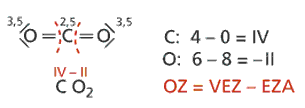 Im Kohlenstoffdioxid ist Kohlenstoff der elektropositivere Partner gegenüber Sauerstoff. Somit werden dem Sauerstoff alle Bindungselektronen der Doppelbindung zugeordnet, woraus sich für die Sauerstoffatome formal eine zweifach negative Ladung und die Oxidationszahl von -II ergibt. Kohlenstoff wird zum formalen mit der Oxidationszahl IV.