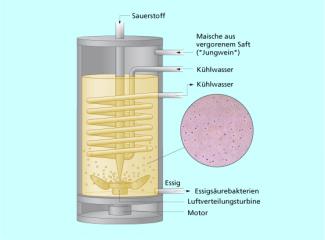 Die biotechnologische Herstellung erfolgt in großen Holzbottichen. Über Buchenholzspäne wird ein Gemisch verrieselt, das Ethanol („Alkohol“) enthält.