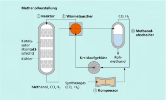 Methanol wird in einer Gleichgewichtsreaktion aus Synthesegas in einem Reaktor hergestellt.