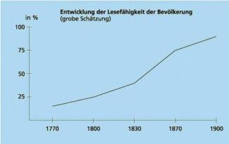 Besonders seit 1848 waren viele Neu-Leser hinzugekommen, da sich die Anzahl der Menschen, die lesen konnten, durch Verbesserungen im Volksschulwesen ständig erhöht hatte. Auf der Basis des Volksschulsystems sank die Zahl der Nicht-Leser zwischen 1840 und 1890 von 50% auf 10%.