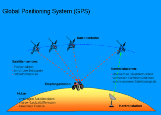 Das GPS (Global Positioning System) ist ein satellitengestütztes System zur Ortung von ortsfesten oder bewegten Objekten auf der Erdoberfläche. Es ist für die Luft- und Schifffahrt sowie für Navigationsgeräte in Kraftfahrzeugen von Bedeutung. Das GPS ermöglicht über Satelliten bereits eine Genauigkeit der Ortsbestimmung von wenigen Zentimetern. An der Vervollkommnung des Systems zur Erhöhung der Messgenauigkeit wird ständig gearbeitet.