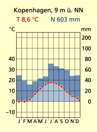 Dänemark hat bei vorherrschenden West- und Südwestwinden Seeklima mit kühlen Sommern und milden Wintern und einer relativ hohen Luftfeuchte (Bild 3). Die mittleren Temperaturen liegen im Sommer bei 16 bis 18 °C, im Winter um 0 °C. Die jährlichen Niederschlagssummen nehmen vom Westen mit etwa 800 mm nach Osten hin ab (auf Bornholm 450 mm).
