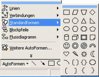 Die entsprechenden Objekte werden über das Menü „Einfügen“ „Grafik“ „AutoFormen“ erzeugt. Es erscheint eine kleine Leiste mit Schaltern zur Auswahl spezieller Formen. Die gleichen Objekte lassen sich auch mithilfe der Zeichnen-Leiste erstellen.