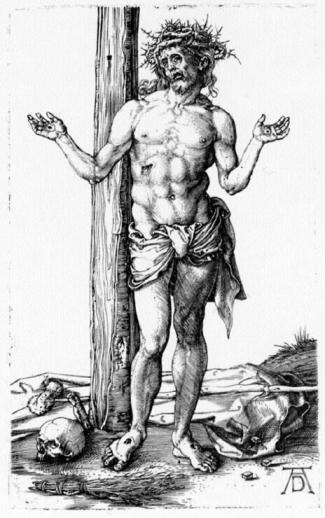 Schmerzensmann mit gehobenen Händen, Entwurf: ALBRECHT DÜRER, Ausführung: ALBRECHT DÜRER, um 1500,Kupferstich, 115 x 70 mm, New York, The Metropolitain Museum, Department of Drawings