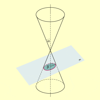 Die folgende Abbildung zeigt nochmals das Entstehen der Kegelschnitte Kreis, Ellipse, Parabel und Hyperbel (wobei hier nicht auf den halben Öffnungswinkel , sondern auf den Neigungswinkel der Mantellinie gegenüber der Grundfläche Bezug genommen wird).