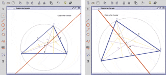Durch Ziehen an den Eckpunkten lässt sich das einmal konstruierte Dreieck beliebig verändern. Der veranschaulichte geometrische Zusammenhang, die eulersche Gerade, bleibt dabei erhalten.