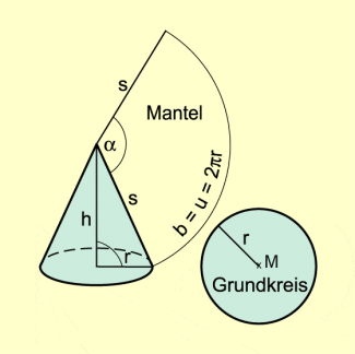 Die Oberfläche eines Kegels setzt sich aus seiner Grundfläche und seiner Mantelfläche zusammen. Der Mantel ist ein Kreissektor mit dem Zentriwinkel und der Mantellinie s als Radius, sodass gilt: