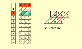 Bei seinen Untersuchungen des Multiplikationsalgorithmus fand JOHN NAPIER heraus, dass auch für die Multiplikation mehrstelliger Zahlen das kleine Einmaleins ausreicht, wenn man die Zwischenergebnisse geschickt addiert. Dazu änderte er die schon bekannte Einmaleins-Tafel so ab, dass die zu addierenden Zahlen leicht erfasst wurden. Der „Trick“ bestand darin, die Einmaleins-Produkte durch transversale Linien getrennt zu schreiben.