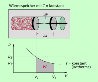 Sie entspricht der Fläche unterhalb des Graphen (Isotherme) im p-V-Diagramm (Bild 1). Sie ist umso größer, je höher die Temperatur ist und je größer die Volumenänderung ist.