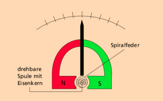 Deshalb kann man eine nahezu gleichmäßig unterteilte Messkala verwenden, an der ein mit der Drehfeder verbundener Zeiger den Zahlenwert der Stromstärke anzeigt.