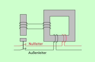 In einem Fehlerstromschutzschalter wird der zum Verbraucher fließende Strom und der von dort zurückkehrende Strom so über einen Transformator mit Eisenkern geleitet, dass sich die von beiden Strömen induzierteMagnetfelder gerade gegenseitig aufheben. Im störungsfreien Betrieb sind der zum Verbraucher gelangende und der von dort kommend Strom gleich groß. Erfolgt ein unkontrollierter Stromabgang, beispielsweise wenn der Strom anstatt durch den Rückleiter über die Metallhülle eines Gerätes oder den Körper eines Menschen abfließt, dann haben Hin- und Rückstrom im Fehlerstromschutzschalter unterschiedliche Stärken wodurch sich die von ihnen hervorgerufenen Magnetfelder nicht mehr kompensieren. Das verbleibende Restfeld induziert in einer weiteren Spule eine Spannung, mittels derer ein Schalter ausgelöst wird, der den Stromkreis zum Verbraucher unterbricht. Je nach Bauart können Fehlerstromschutzschalter schon bei Fehlerströmen von einigen Milliampere auslösen.